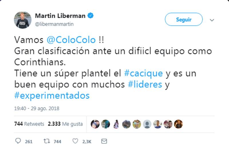 Tal cual, pues tras el paso de Colo Colo a cuartos de final de la Libertadores, Martín Liberman posteó en su Twitter: "¡Vamos Colo Colo! Gran clasificación ante un difícil equipo como Corinthians. Tiene un súper plantel el Cacique y es un buen equipo con muchos líderes y experimentados".