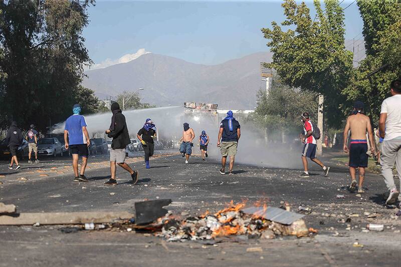 La intersección de Grecia con Pedro de Valdivia fue el foco de los incidentes, donde los hinchas se enfrentaron a la policía con barricadas y proyectiles, pero la apuesta de los manifestantes fue creciendo, y al final entraron al entorno del estadio, llegando incluso a los accesos directos.