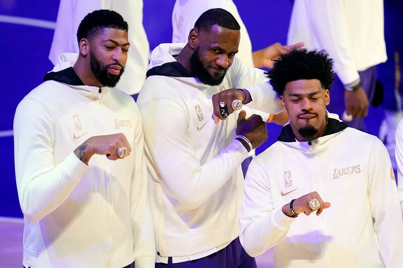 Antes del juego se celebró la ceremonia de entrega de los anillos de campeón a la plantilla y cuerpo técnico de los Lakers, que derrotaron en octubre a los Miami Heat en las finales en Disney World (Orlando).