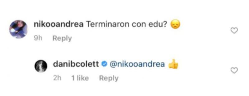 En una de sus últimas publicaciones del Instagram de Daniela (@Danibcolett), realizada el 30 de junio y donde se ve mostrando unos aros, una seguidora fue al grano con la interrogante en los comentarios. "¿Terminaron con Edu?", fue la consulta de @Nikoandrea.