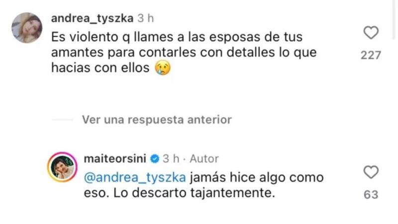 “Es violento que llames a las esposas de tus amantes para contarles con detalle lo que hacías con ellos”, escribió una usuaria, haciendo referencia a las presuntas conversaciones que habría tenido Orsini con Viera.
