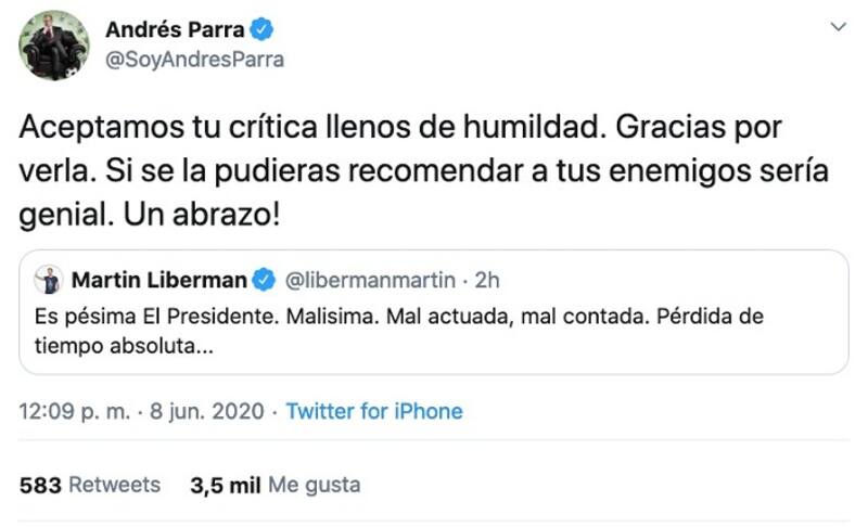 "Aceptamos tu crítica llenos de humildad. Gracias por verla. Si se la pudieras recomendar a tus enemigos sería genial. Un abrazo!", le escribió de vuelta Andrés Parra.