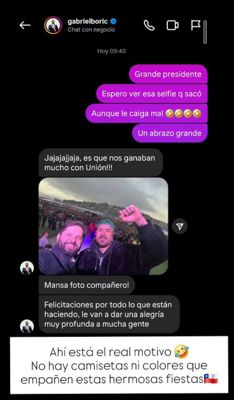 Boric le envió la foto y le respondió: “Jajajá ¡Es que nos ganaban mucho con Unión!”.