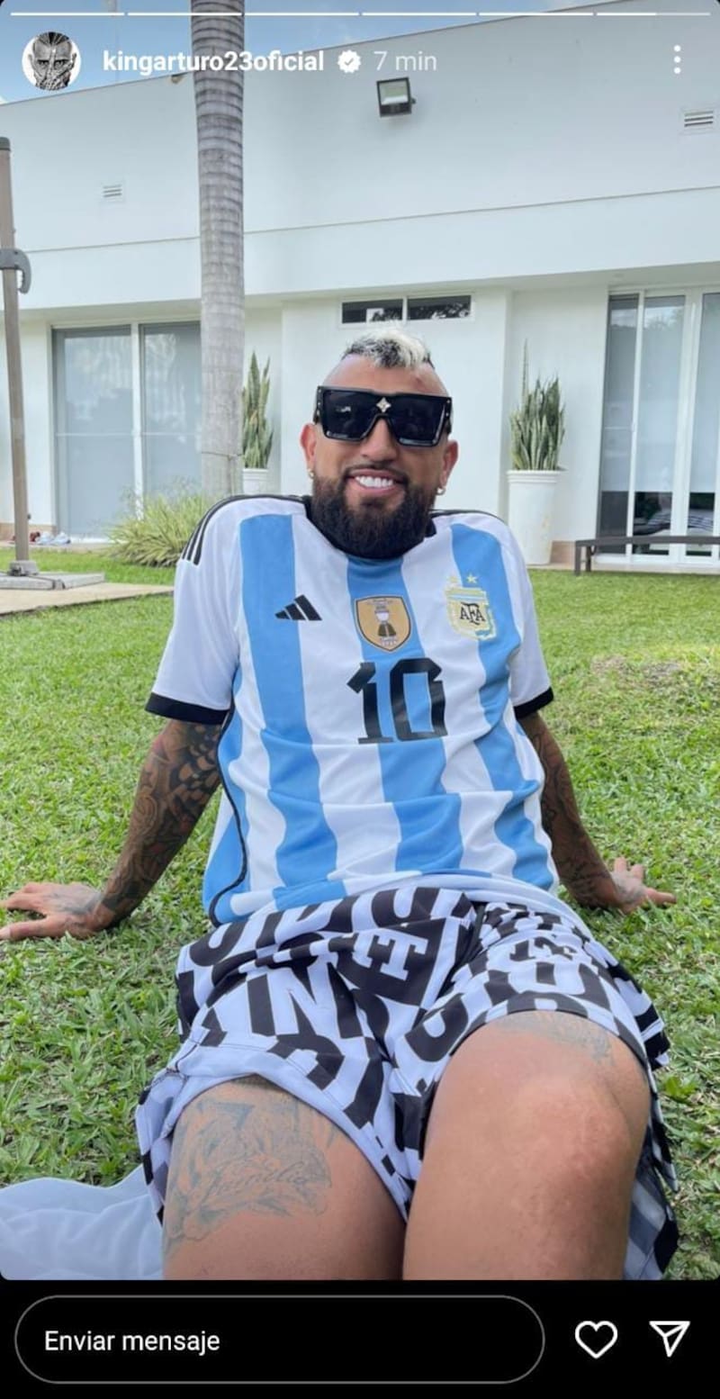 “Mufa me decían. Argentina campeones del mundo”, expresó el chileno con emojis de risa y de los trasandinos sorprendiendo posteriormente tras posar con la camiseta de Argentina.