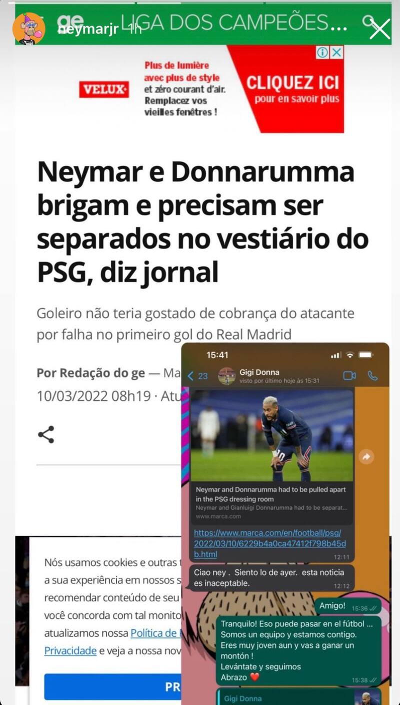 Eso sí, todo ese cahuín fue desmentido este jueves por el propio jugador brasileño. Incluso, Ney compartió e una historia de Instagram una conversación que tuvo con el enguantado italiano a través de WhatsApp.