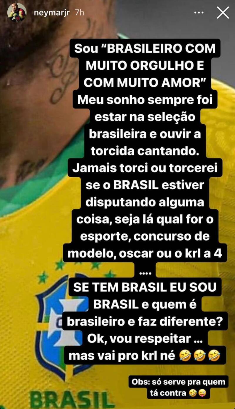 "Soy brasileño con mucho orgullo y con mucho amor. Mi sueño siempre fue estar en la selección brasileña y escuchar cantar a la afición", dijo "Ney" en una historia de Instagram.