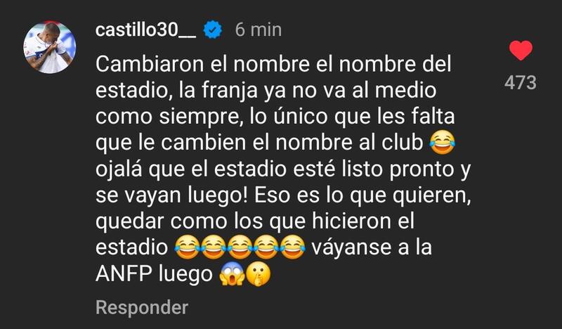 “Cambiaron el nombre del estadio, la franja ya no va al medio como siempre, lo único que les falta es que le cambien el nombre al club. Ojalá que el estadio esté listo pronto y se vayan luego! Eso es lo que quieren, quedar como los que hicieron el estadio. Váyanse luego a la ANFP”, manifestó Nico, cuyo contrato no fue renovado para 2025.