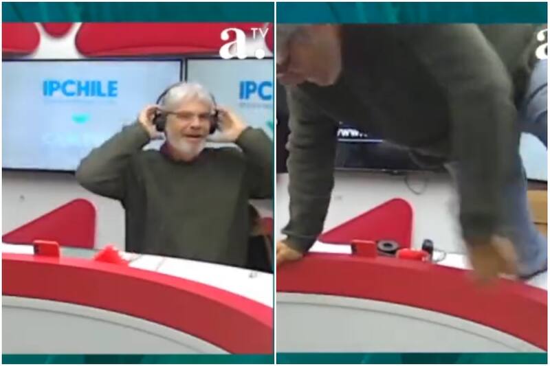 Entonces, para sorpresa —y las risas de los presentes—, en plena transmisión el periodista trepó sobre la mesa que tenía enfrente… sólo para dejarse caer, “atacado” aún por lo que pudo ser el tanto de la victoria.