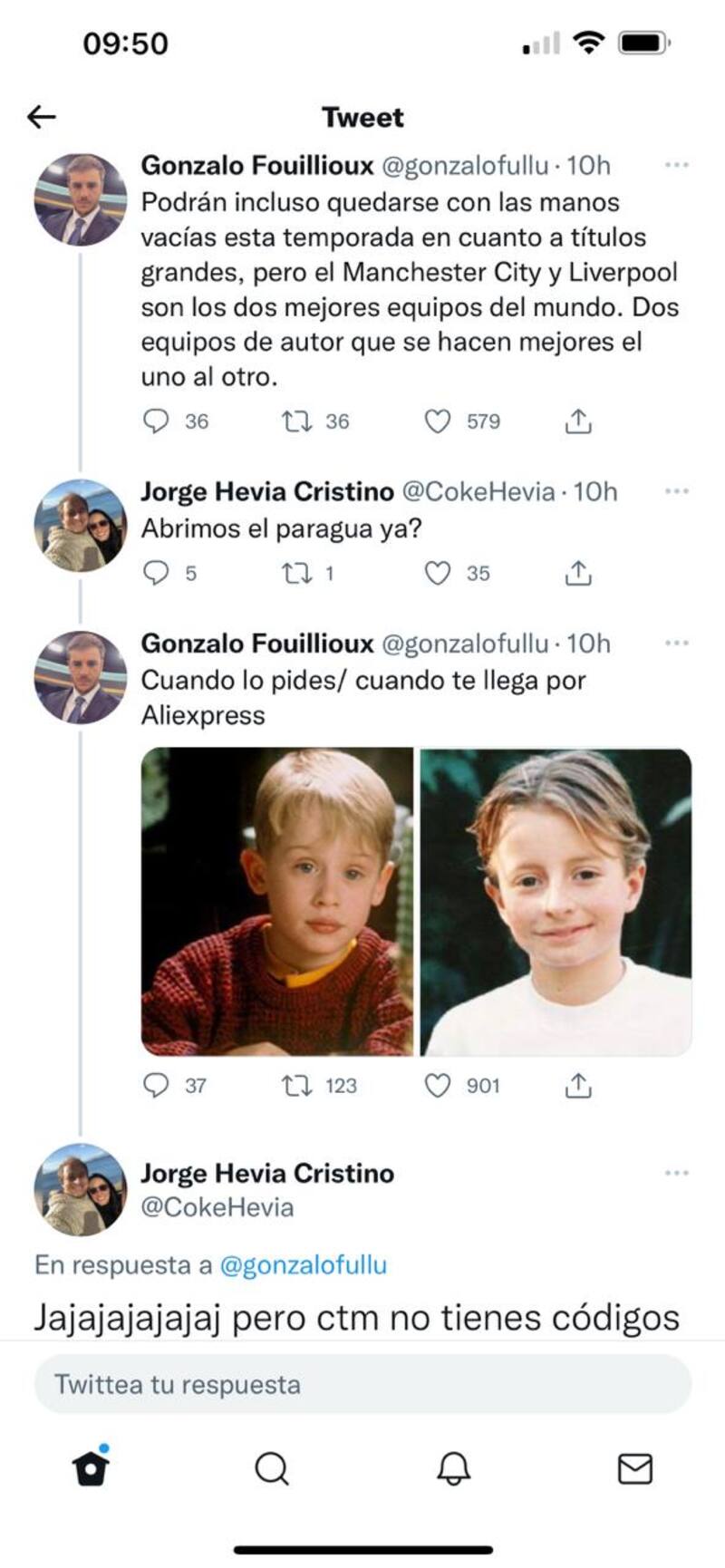 A los segundos, Hevia metió la cuchara y le respondió a su tui. “¿Abrimos el paragua ya?”, le respondió. Sin embargo, Fouillioux no se quedó callado y arremetió con su mejor artillería: un meme donde compara a su colega con Macaulay Culkin.