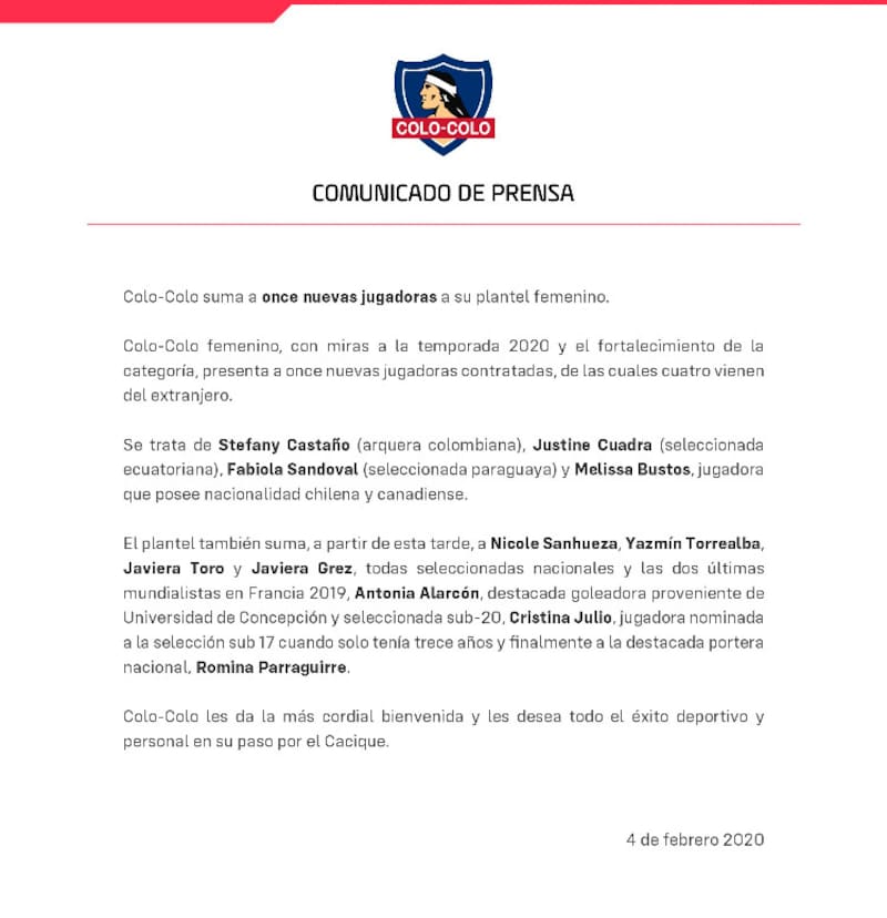 Con estas novedades Colo Colo espera que su equipo femenino logre hazañas parecidas a la del 2012 cuando se coronaron como campeonas de la Copa Libertadores femenina.