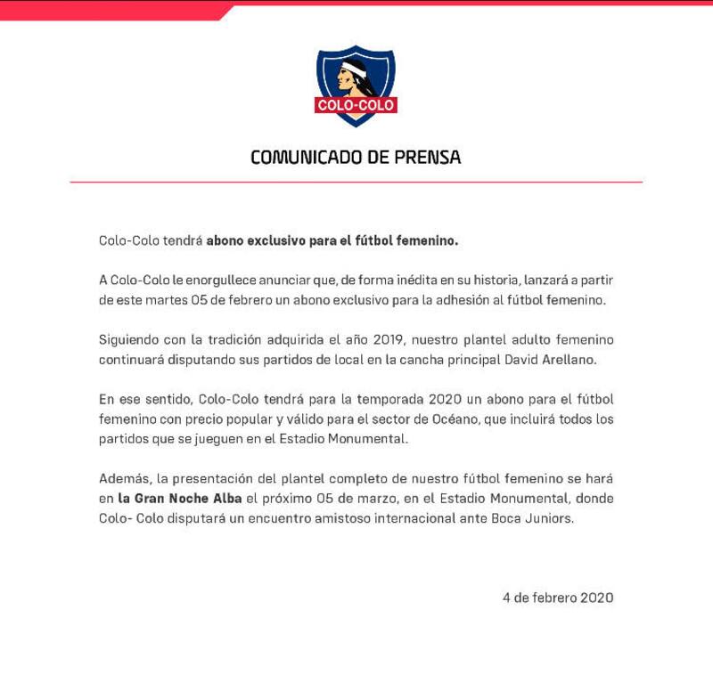 Este martes Colo Colo informó que el que su plantel femenino tendrá su respectiva noche alba. Cita que será el próximo 5 de marzo, donde disputará un amistoso internacional ante Boca Juniors.