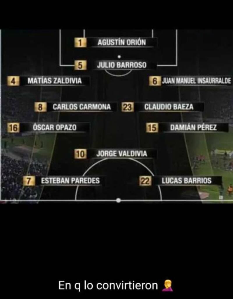 "En qué lo convirtieron", reza una de las fotos, donde aparece la alineación colocolina que alcanzó los 4tos de final de Copa Libertadores. Específicamente, el recuerdo corresponde al partido de vuelta por los 8vos de final, instancia en que el Eterno eliminó a Corinthians en Brasil. Aquella noche, Orión y Valdivia brillaron en la derrota (1-2) ante el Timao.