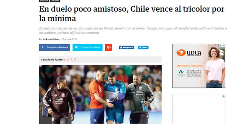 "Pasaron dos años, pero el cotejo de ayer bien pudo ser una revancha inmediata, una que no respetó ni escenario, ni instancia, ni reglas. Chile y México se envolvieron en una encarnizada lucha por hacerse del triunfo, y del orgullo, que fue lo que ayer se disputó en la cancha del Corregidor", sentenció Razón.