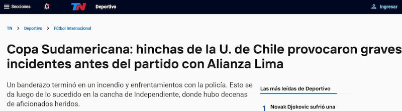 “Copa Sudamericana: hinchas de la U. de Chile provocaron graves incidentes antes del partido con Alianza Lima”, tituló TN.
