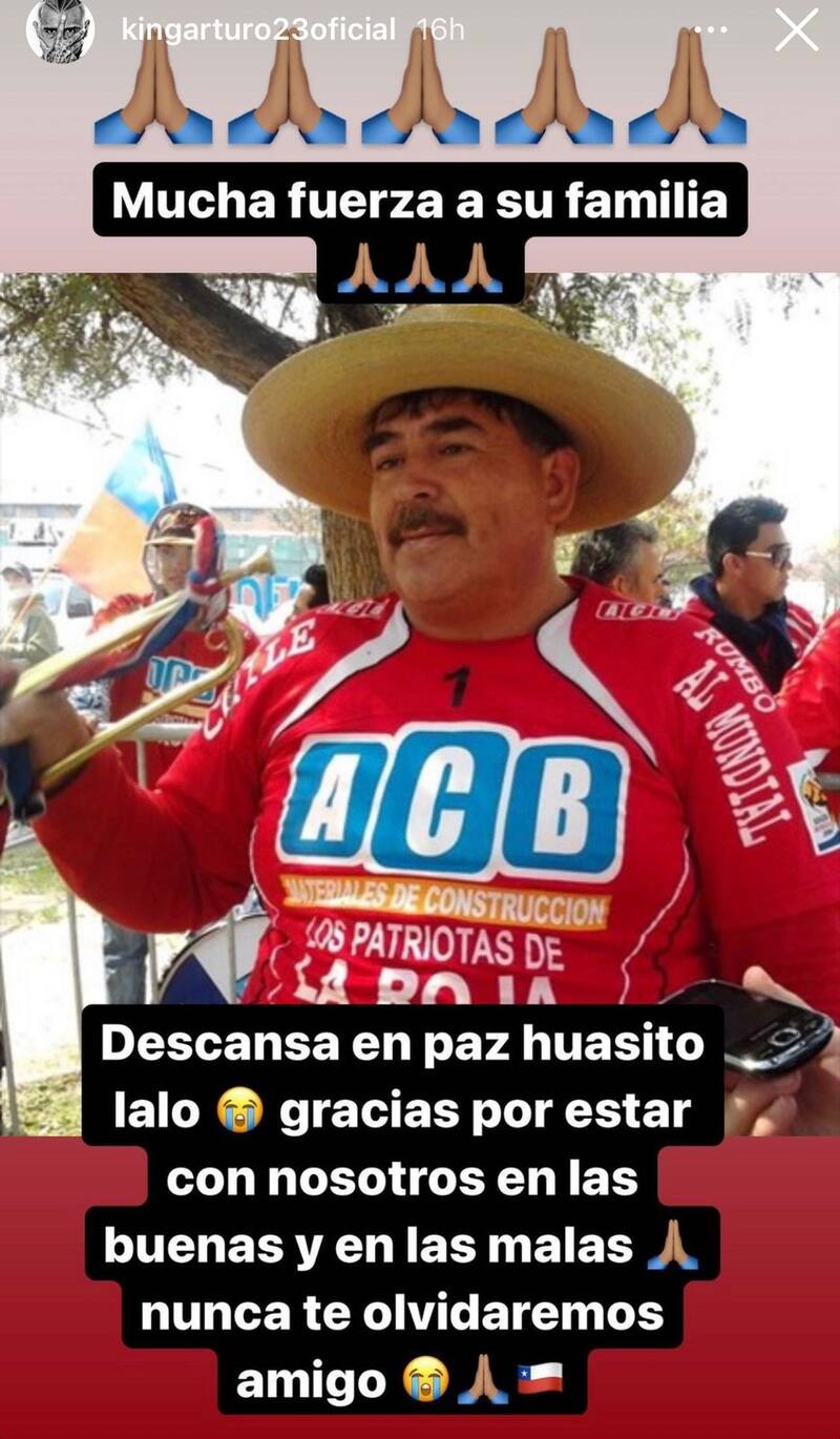 Un duro golpe recibieron la madrugada e este lunes los jugadores de la selección chilena. Esto, luego que se confirmara la muerte de Raúl Palma (56), más conocido como el "Huaso Lalo". Por lo mismo, varios ídolos del "equipo de todos" no quedaron indiferentes a su deceso y le dedicaron emotivos mensajes a través de redes sociales. "Descansa en paz. Gracias por estar con nosotros en las buenas y en las malas. Nunca te olvidaremos, amigo. Mucha fuerza a su familia", escribió Arturo Vidal en sus historias de Instagram. Por su parte, Gary Medel también le dedicó un emotivo mensaje tras enterarse de la noticia. "Gracias por el apoyo todos estos años. Descansa en paz, 'Huasito Lalo'", complementó el "Pitbull". Cabe recordar que el recordado hincha de la Roja, desde la llegada de Marcelo Bielsa al país, se paseó por Sudáfrica, Brasil y un Sudamericano Sub 20 en Argentina, donde sufrió una recordada agresión al defender su bandera chilena.