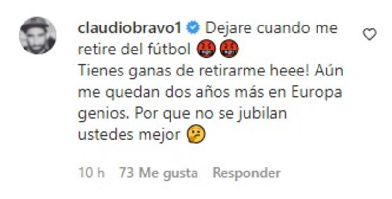 “Dejaré cuando me retire del fútbol. Tienes ganas de retirarme heee! Aún me quedan dos años más en Europa genios. Por qué no se jubilan ustedes mejor”, escribió Claudio Bravo junto a emojis enojados, dejando en evidencia su molestia y confirmando que aún no piensa en dejar el arco de La Roja.