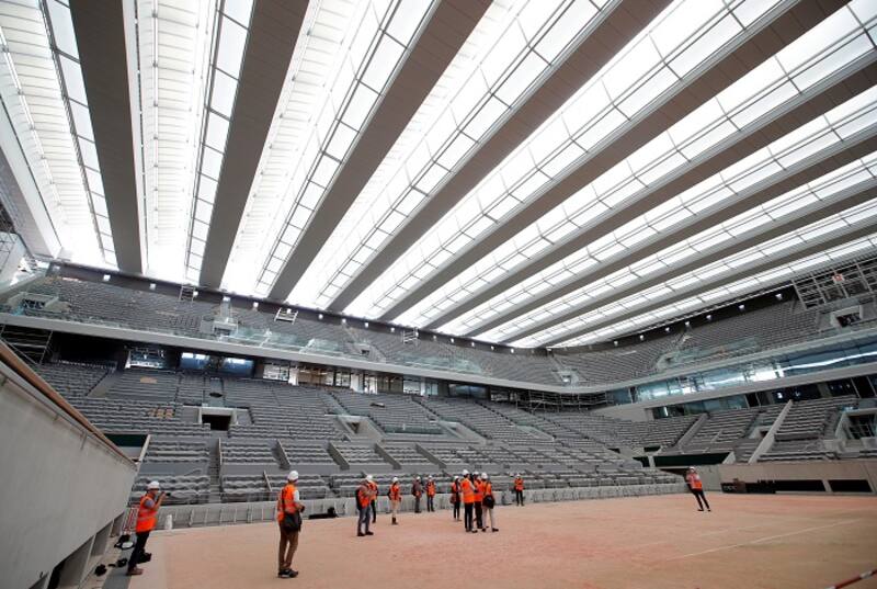 Journalists visit the renovated Philippe-Chatrier central tennis court with its new retractable roof composed of 11 wings at Roland-Garros in Paris, France, May 27, 2020. Roland-Garros remains closed to the public, with the hope the tournament may still take place later in 2020. REUTERS/Charles Platiau[/caption]