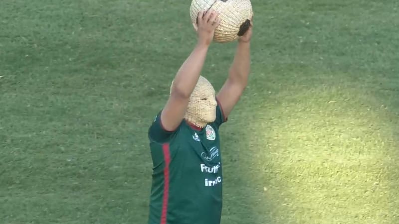 Mimbreman luce la clásica camiseta verde del cuadro de la región de O’Higgins, pero su rostro está cubierto por una máscara de mimbre, la cual solo deja espacio para los ojos de quien la porta.