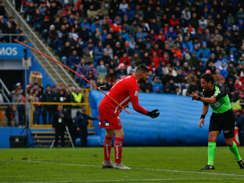 Un poco antes, el mismo meta le entregó al árbitro Eduardo Gamboa un tubo que cayó cerca del arco. Pese a la advertencia reiterada desde alto parlantes del estadio, la hinchada de la UC también encendió bengalas dentro del recinto deportivo.