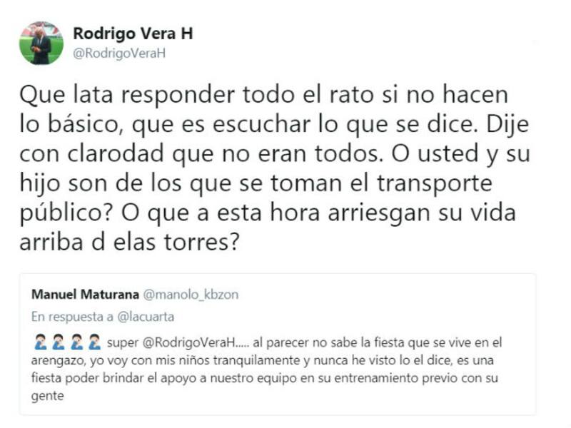 "Que lata responder todo el rato si no hacen lo básico, que es escuchar lo que se dice. Dije con claridad que no eran todos. O usted y su hijo son de los que se toman el transporte público? O que a esta hora arriesgan su vida arriba de las torres?", respondió el periodista.