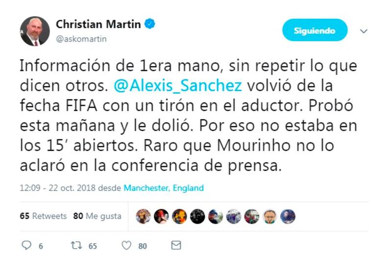 "Información de 1era mano, sin repetir lo que dicen otros. Alexis Sánchez volvió de la fecha FIFA con un tirón en el aductor. Probó esta mañana y le dolió. Por eso no estaba en los 15' abiertos. Raro que Mourinho no lo aclaró en la conferencia de prensa", publicó en su cuenta de Twitter apagando todo tipo de conspiraciones de quiebres entre el delantero de la Roja y el DT.