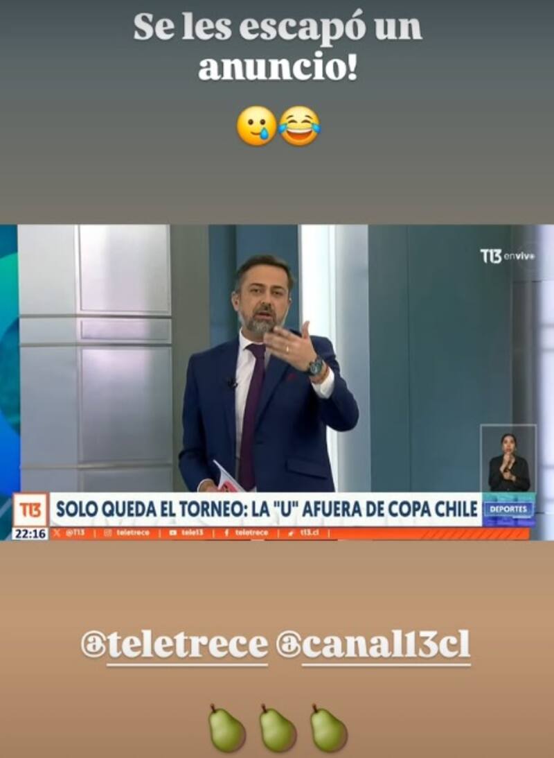 “Se les escapó un anuncio”, ironizó el jugador Además, etiquetó a la señal y a Teletrece, publicando imágenes de peras.