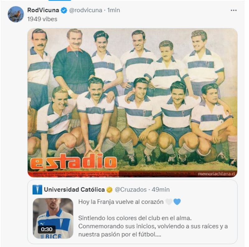 Resulta que la renovada indumentaria de los cruzados, elaborada por Puma, busca conmemorar los inicios del equipo, al rememorar el primer campeonato de la UC, allá por el año 1949.
