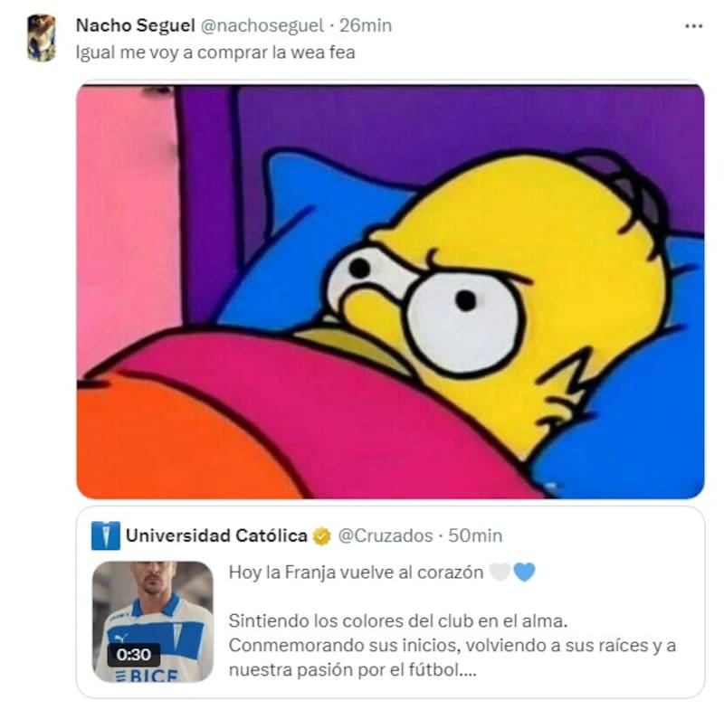 “No había visto camiseta de la UC más fea que esta”; “Su emblema es la franja (en la guata), sin ella pierde la poca mística que tienen”; “Es la camiseta más fea de la historia de la UC”; “Jajajá ¡está horrible! Pero igual me la voy a comprar”; fueron algunos de los comentarios negativos.