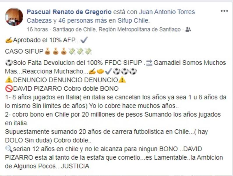 Una nueva polémica sacude al Sifup por el tema bono de retiro para los ex futbolistas. Esto, porque Pascual de Gregorio aprovechó la contingencia nacional sobre la reciente aprobación de la Cámara de Diputados al retiro del 10% de la AFP para lanzarse contra el gremio futbolero y David Pizarro.