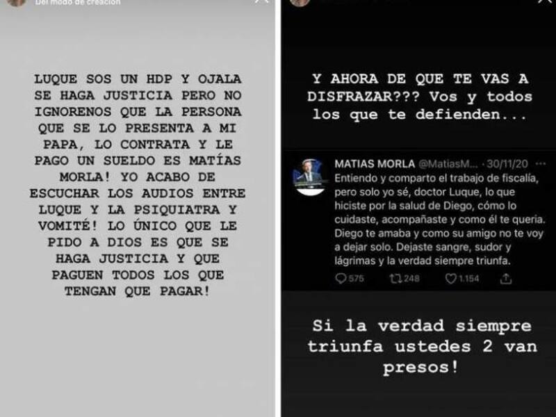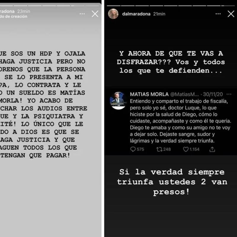 Tras la divulgación de los mensajes de voz, la hija mayor de Maradona, Dalma, recogió el guante: "Luque sos un HDP y ojalá se haga justicia", tiró en una historia de Instagram.