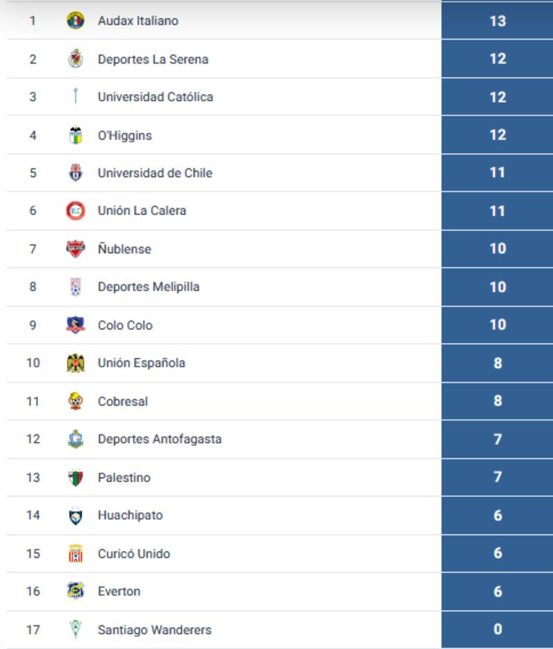 Con este resultado, Audax quedó como único puntero con 13 puntos, mientras que Cobresal se mantiene en la posición 11 con 8 puntos.