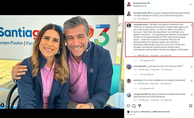 “Fernando, qué pena el comentario que hiciste de mi querida sobrina Isidora Jiménez”, partió declarando Paula Jiménez, en un comentario que le dejó a Solabarrieta en su cuenta de Instagram.