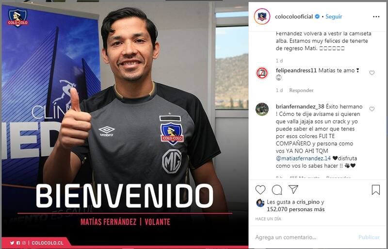 "Éxito hermano ! Cómo te dije avísame si quieren que valla jajaja sos un crack y yo puedo saber el amor que tenes por esos colores FUI TE COMPAÑERO y persona como vos YA NO AHI TCM @matiasfernandez.14 disfruta como vos lo sabes hacer !!" (sic), escribió el trasandino en la publicación de Instagram en que Colo Colo anunció el retorno de Fernández.