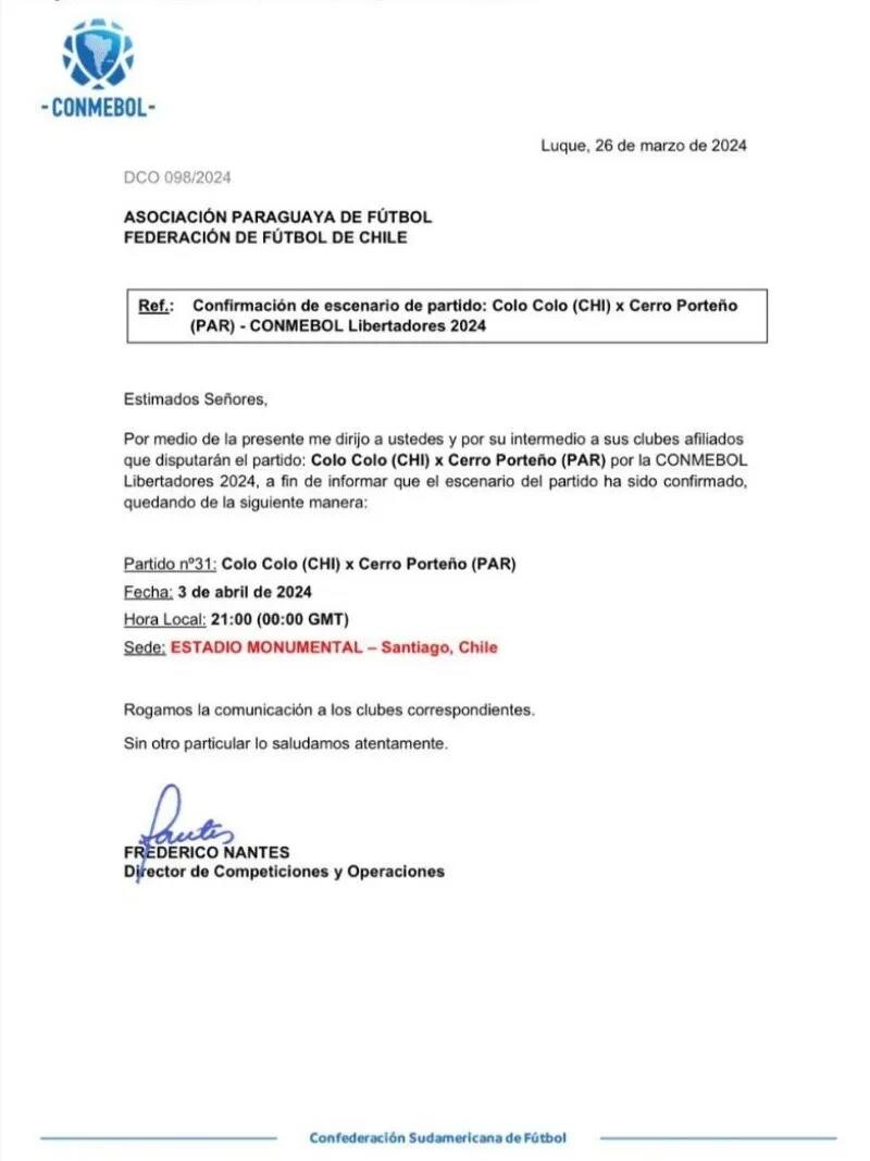 Por Eduardo OrtegaTranquilidad, albos: Conmebol autoriza a Colo Colo para jugar ante Cerro Porteño en el Monumental