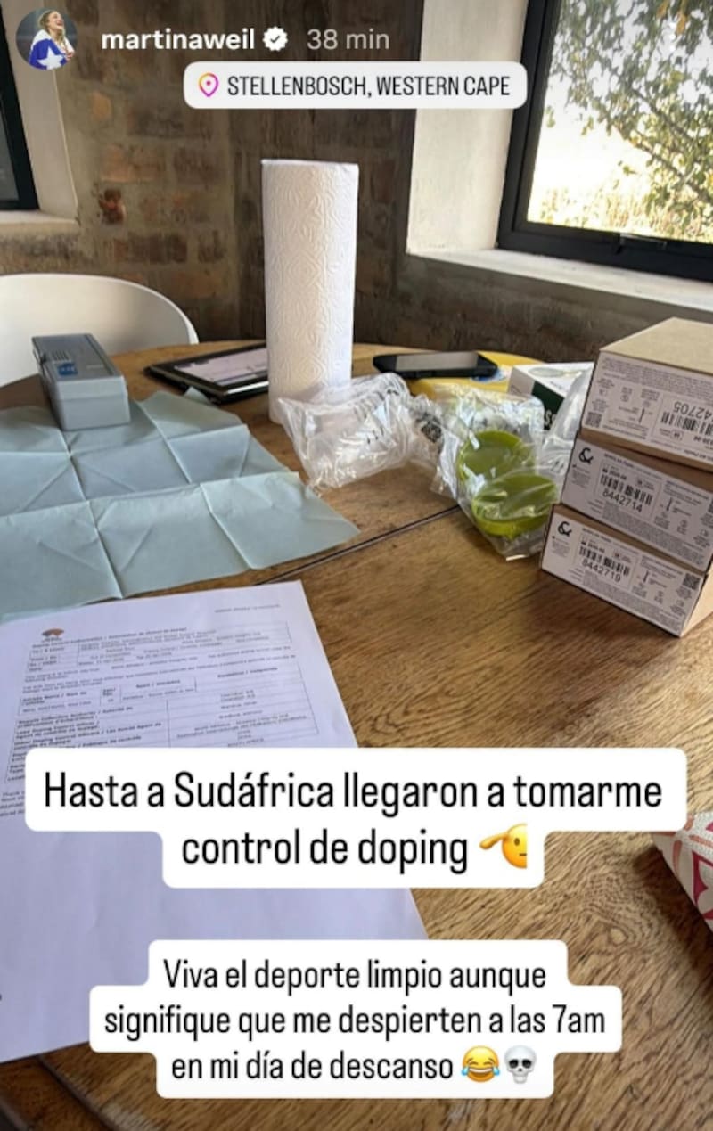 “Hasta a Sudáfrica llegaron a tomarme el control de doping”, comentó en sus historias, junto a una imagen del examen.