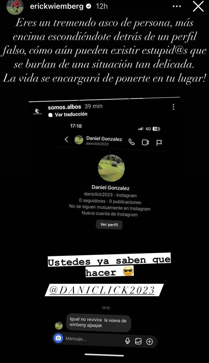Por Juan Carlos Muñoz“Un tremendo asco de persona”: Erick Wiemberg reaccionó contra desubicado que se burló de su hija recién fallecida
