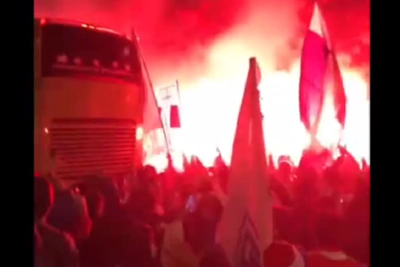 Por esta razón, anoche la barra de "Los Cruzados" realizó un masivo banderazo en las afueras del hotel donde concentra el equipo.