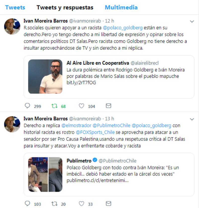 "Redes sociales quieren apoyar a un racista @polaco_goldberg están en su derecho. Pero yo tengo derecho a mi libertad de expresión y opinar sobre los comentarios políticos DT Salas. Pero racista como Goldberg no tiene derecho a insultar aprovechándose de TV y sin derecho a mi réplica"
