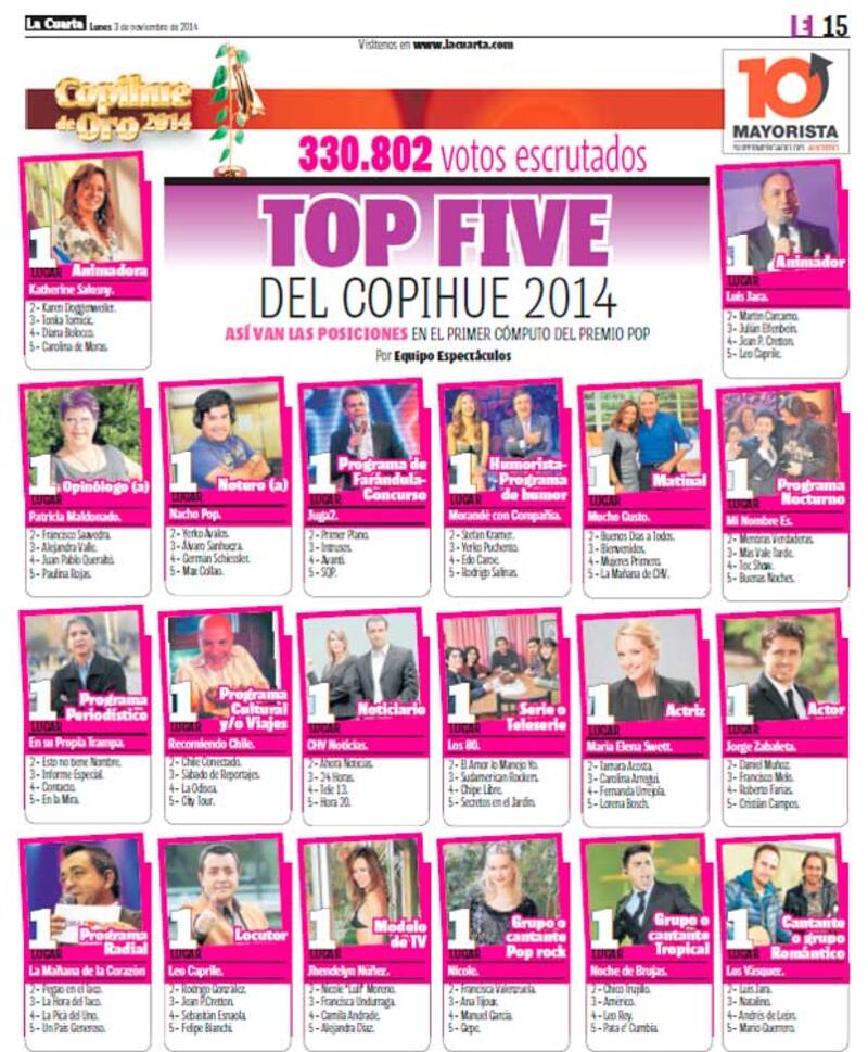 Como se observa en la imagen de abajo, están los cinco primeros lugares en cada una de las 20 categorías. Como se ha hecho hace ya tres años, se omitieron los porcentajes de votos que tienen para que los que van en punta no se confíen y los que están segundo, tercero, cuarto o quinto le pongan más power en su campaña.