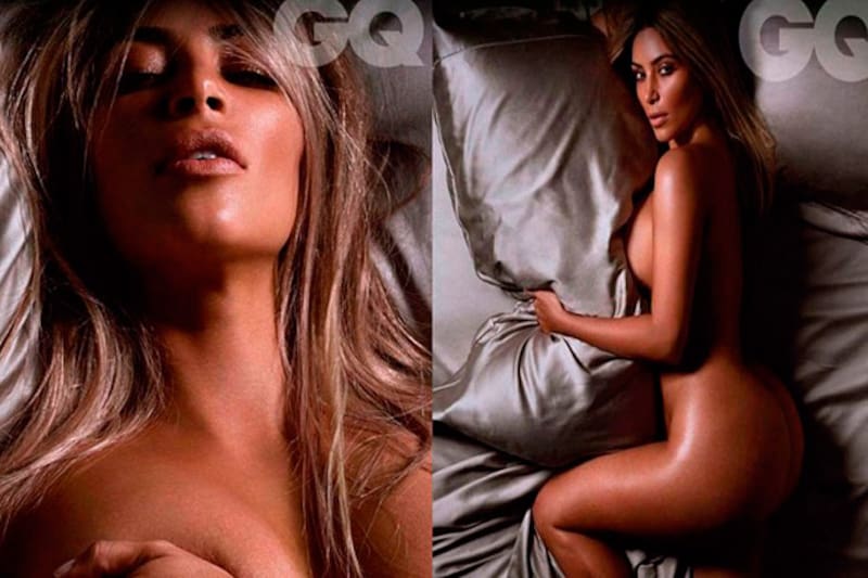 Kim aparece desnuda, sólo vistiendo zapatos de taco rosados y sus partes íntimas tapadas delicadamente por una sábana blanca.