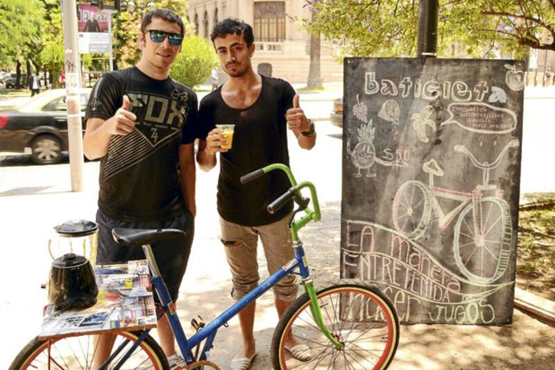 Borys Navarrete (29) y Nicolás Ramírez (28) se instalan a diario en la Plaza Brasil y permiten que cualquier persona que pase por ahí se suba a la bici y en dos minutos de pedaleo exprima un jugo de fruta natural.