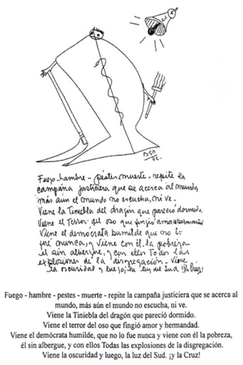 Según el investigador, el dibujo de 1972 es "una figura humana amorfa donde está la antorcha olímpica y el personaje tiene una guadaña en la mano. Atrás hay una campana sonando". Su interpretación coincide con el acto inaugural de la cita deportiva.