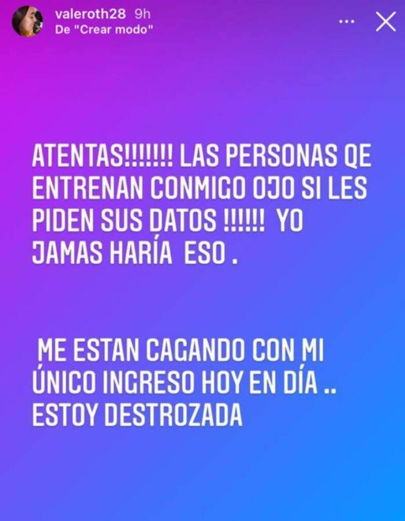 Según su publicación, alguien le está pidiendo datos personales a las personas que entrenan con ella. "Atentas, las personas que entrenan conmigo, ojo si les piden sus datos. Yo jamás haría eso", avisó la bailarina en sus historias de Instagram.