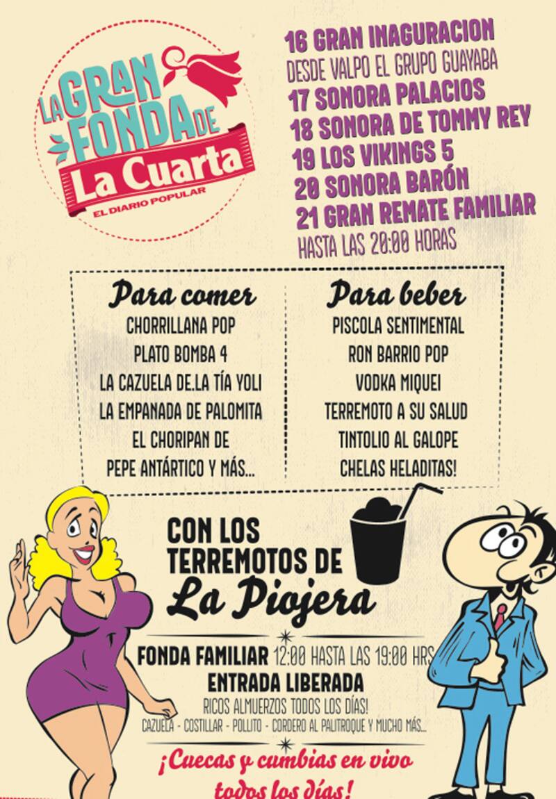 La Gran Fonda de La Cuarta se realizará en el Sporting Club de Viña, y tendrá un costo de $6.500 en horario estelar (desde las 20 horas), incluyendo por ese valor el costo de acceso obligatorio al Sporting ($2.500) si compra su entrada antes del brillo en tiendas Falabella o Cines Hoyts, o del 17 al 20 de septiembre en la boletería ubicada en la puerta de 5 norte con Los Castaños.
