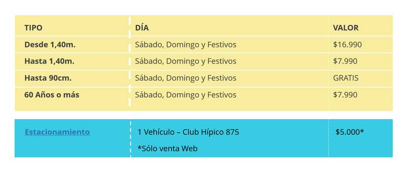 La entrada general cuesta $32.000 y $16.000 para los menores entre 1 y 1,20 mts de altura. Mientras que los menores de 99 cms. ingresan gratis. Las puedes comprar tanto en su boleterías como en la web del parque.