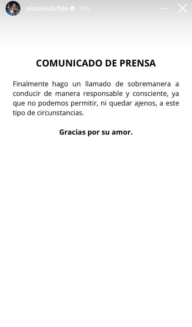 Fue a inicios de esta semana cuando Nicole Moreno, más conocida como “Luli”, informó a través de sus redes sociales que sufrió un accidente de tránsito en Vitacura.