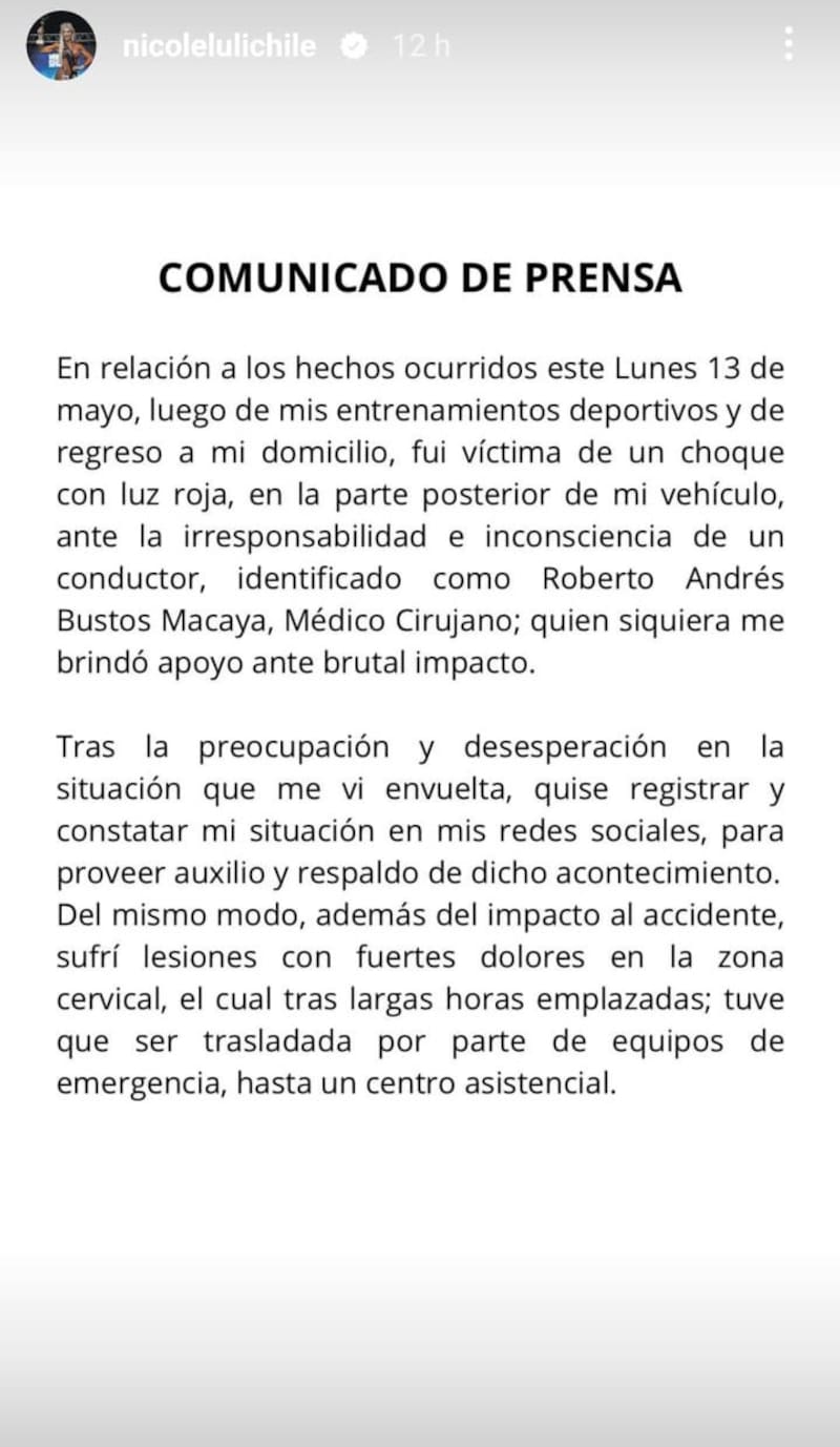 “Fui víctima de un choque con luz roja, en la parte posterior de mi vehículo, ante la irresponsabilidad e inconsciencia de un conductor identificado como Roberto Andrés Bustos Macaya, Médico Cirujano; quien siquiera me brindó apoyo ante el brutal impacto”, acusó Moreno.