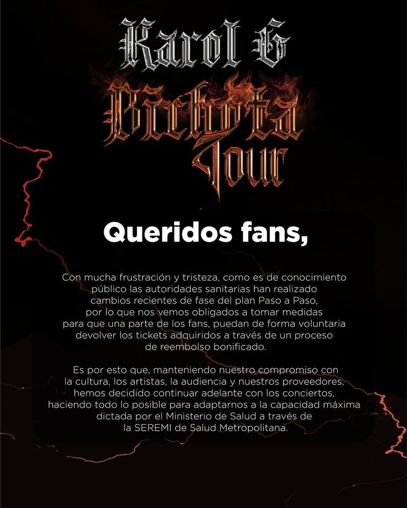 Hace solo unos días, la productora a cargo de los conciertos de Karol G en Chile había puesto en duda la realización de los eventos, debido a los cambios en el plan Paso a Paso que trajeron consigo una reducción en el número de asistentes para los eventos de carácter masivo.