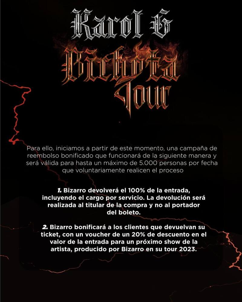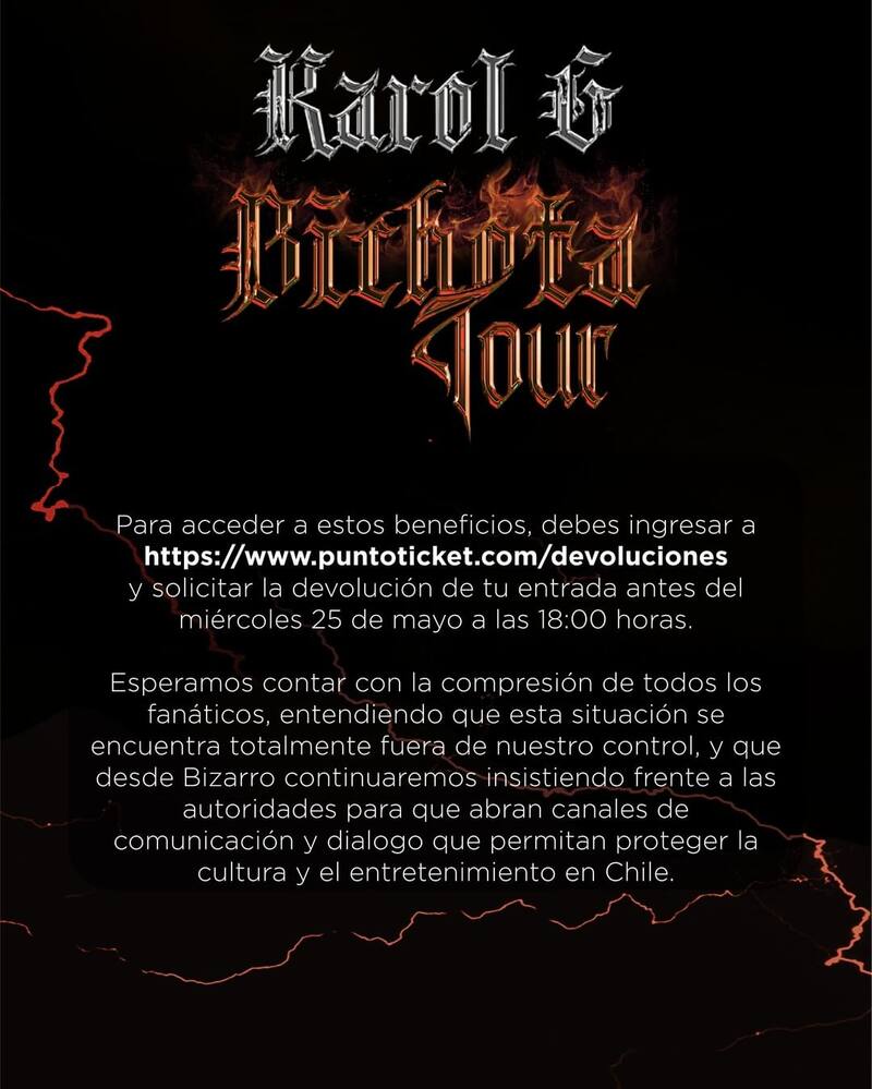 Este determina que quienes devuelvan sus tickets para los shows, recibirán el reembolso de la totalidad de lo que pagaron por ellos (incluido el cargo por servicio), mientras que también se les entregará un voucher de 20% de descuento para la próxima visita de la intérprete de “Mayores” a Chile, la cual se realizará en el marco de su gira 2023.