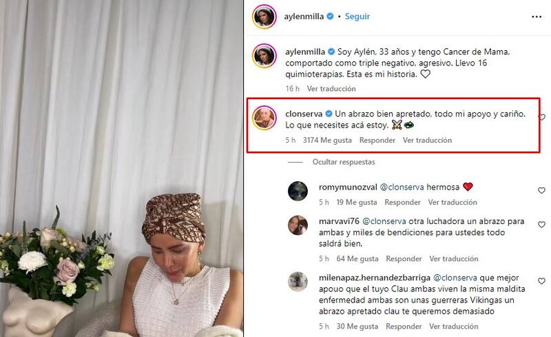 Entre las miles de reacciones de sus seguidores y personajes famosos, destacó el mensaje de apoyo que le dejó Claudia Conserva, quien fue diagnosticada con la misma enfermedad en junio de 2022 y hoy sigue en tratamiento.